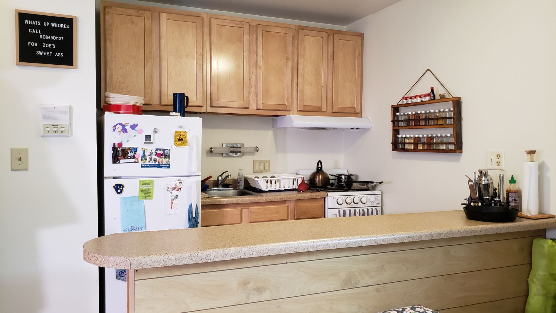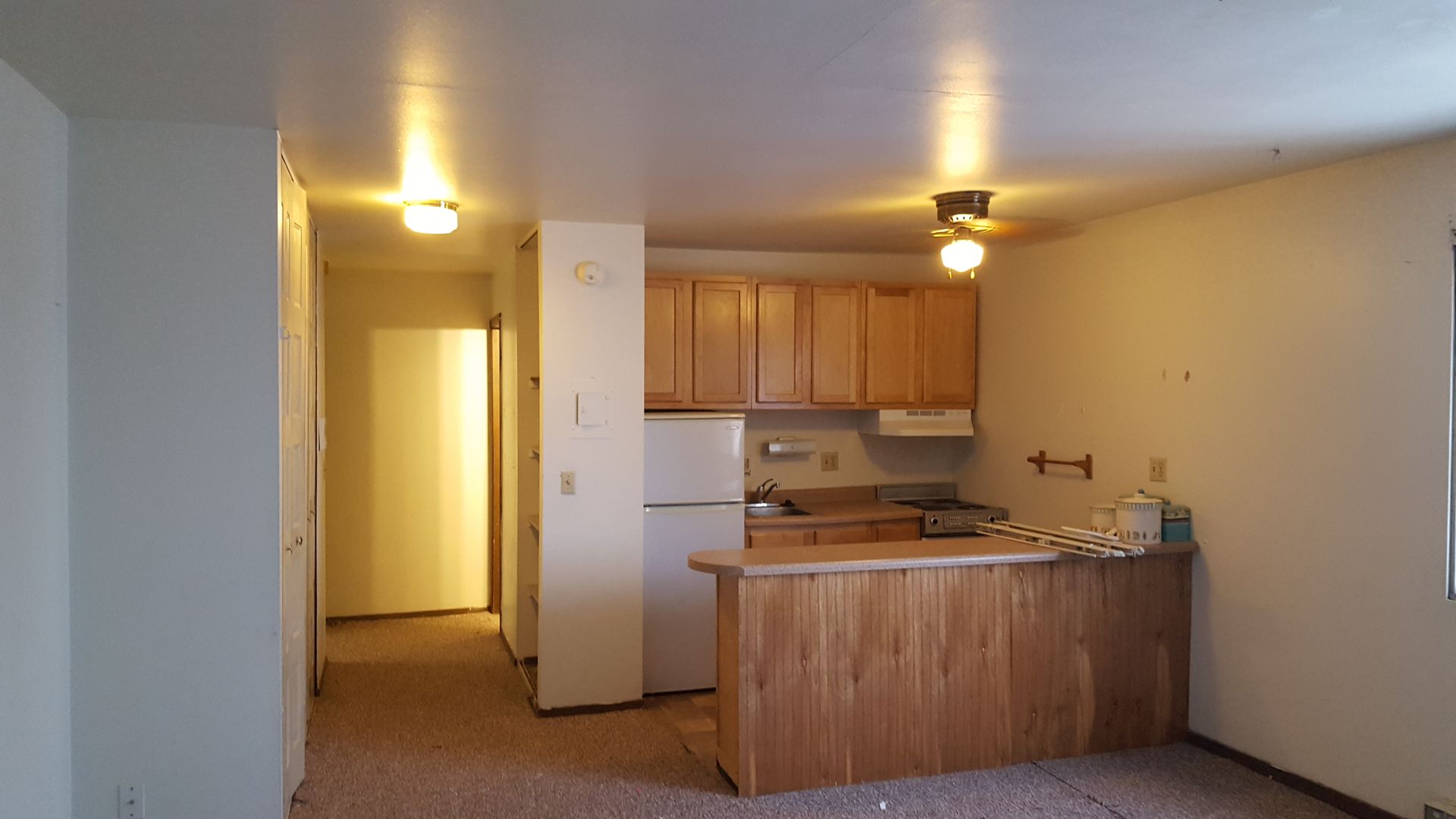Spacious efficiency with lake view available August 15 at 22 Langdon St. Full private bathroom and kitchen with breakfast bar, AC, lots of closet space. $700/mo not including heat or electric (averages $90/mo over 12 months). 1 cat is welcome for $25/mo. Single occupancy only; one year lease until 8/14/27. Sorry no off-street parking. Deposit is one month's rent.